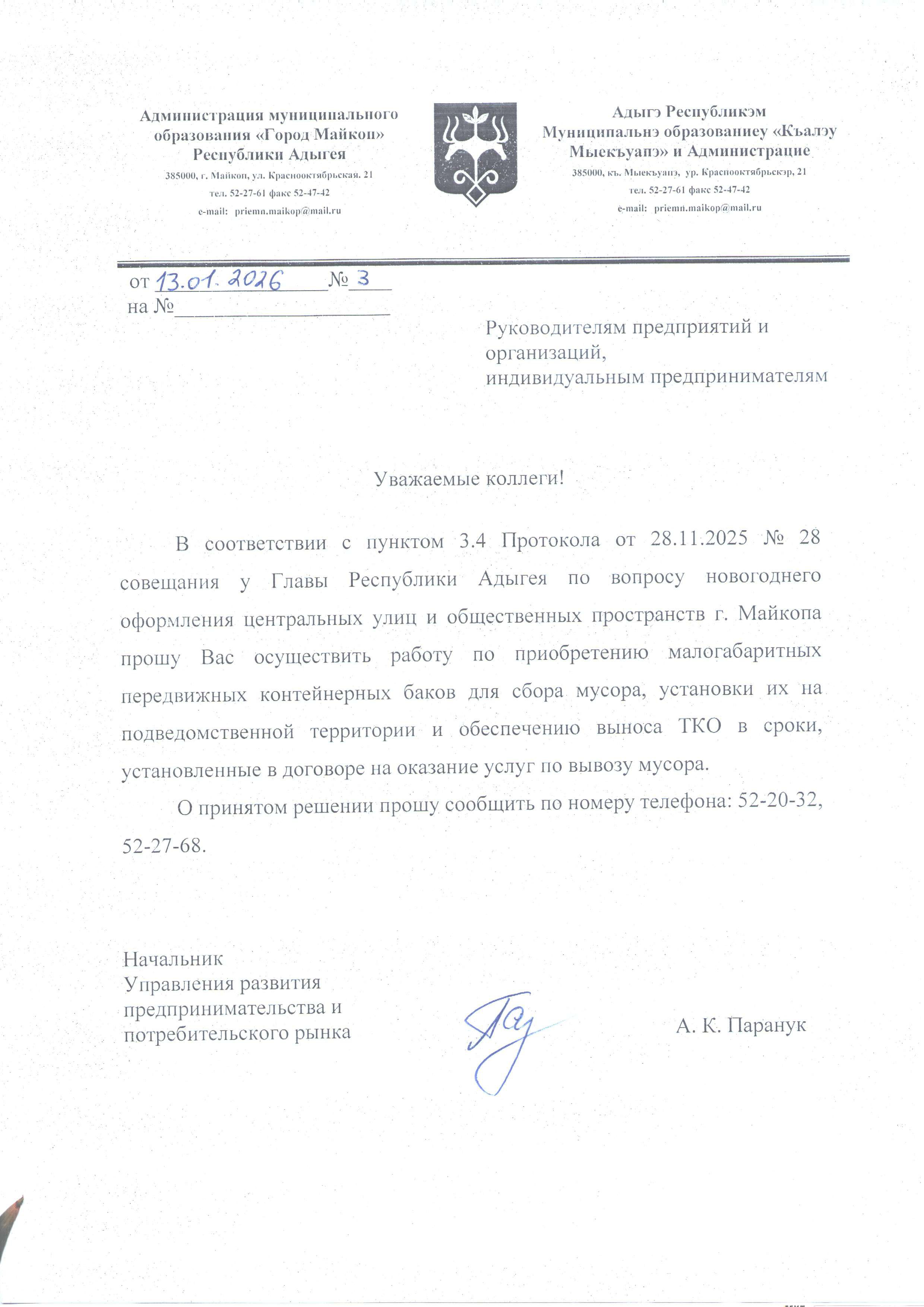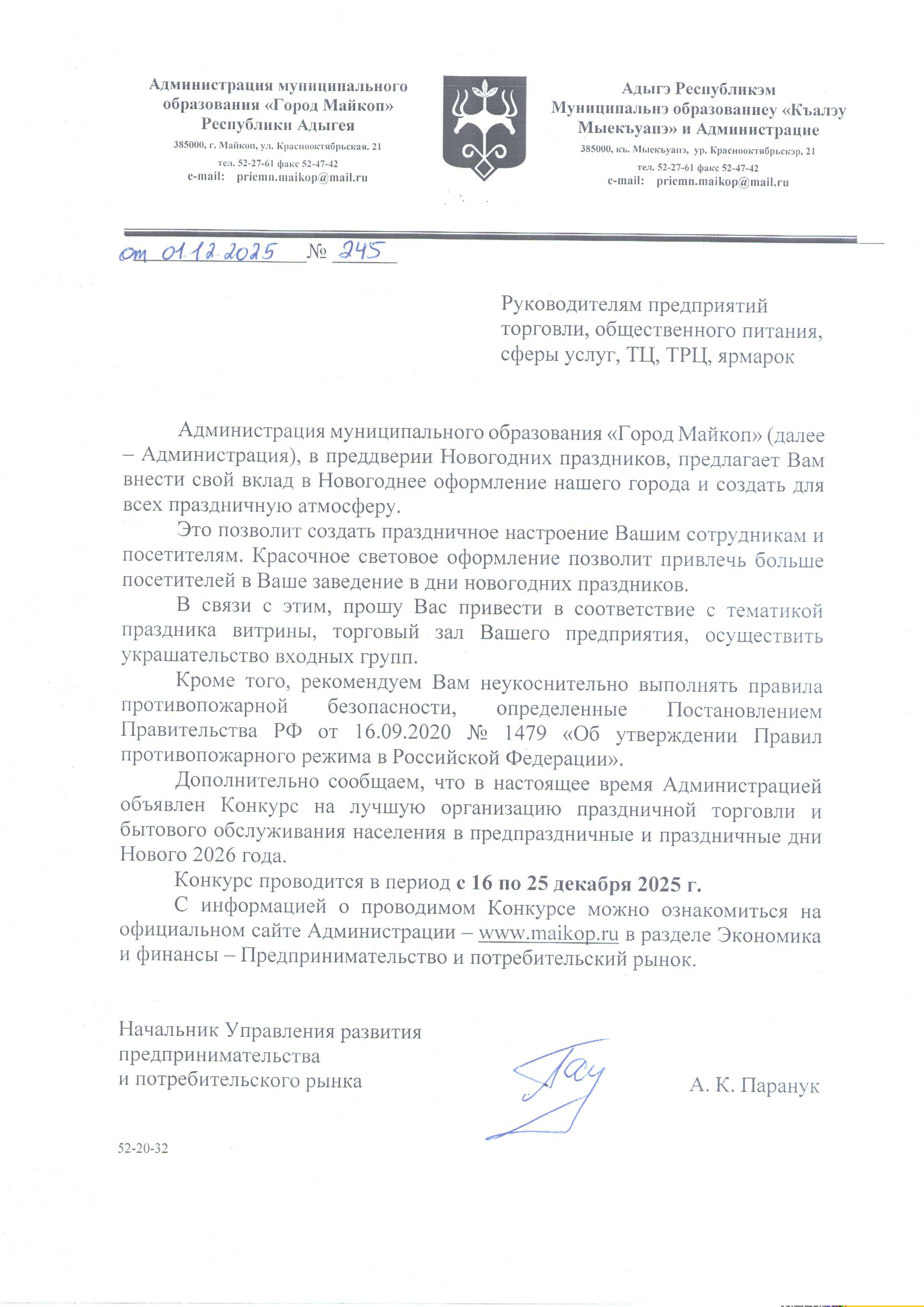 По возникшим вопросам обращаться в Управление развития предпринимательства и потребительского рынка Администрации МО «Город Майкоп» по телефонам: 8 (8772) 52-58-71, 8 (8772) 52-27-68.