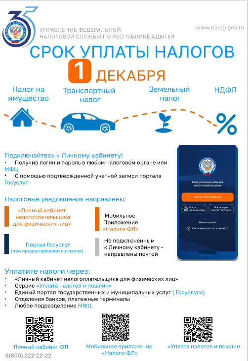 УФНС России по Республике Адыгея, напоминает об уплате имущественных налогов.