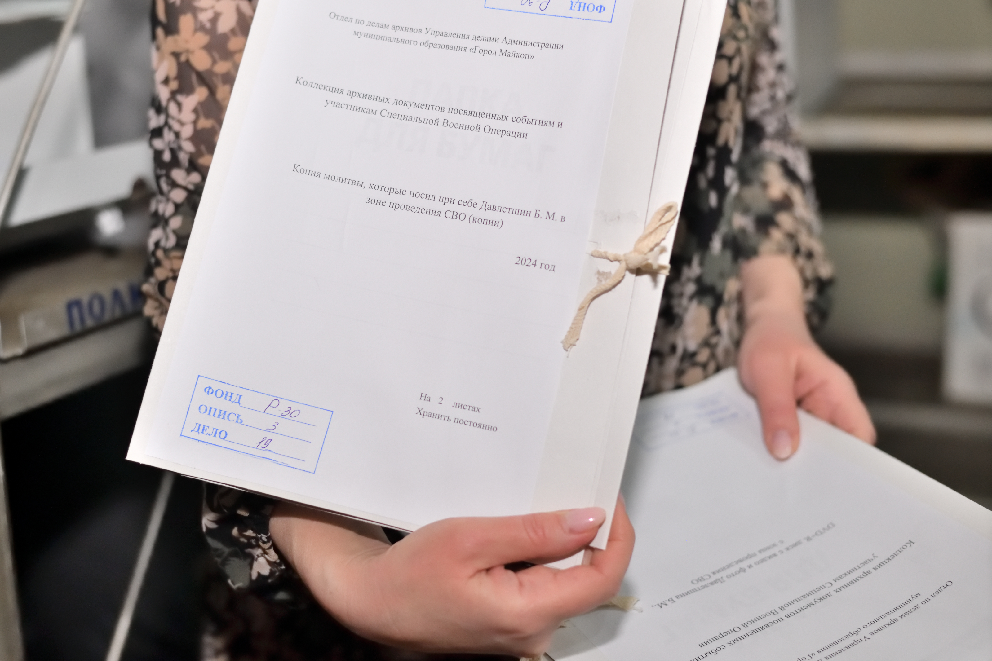 Отдел по делам архивов Управления делами Администрации муниципального образования «Город Майкоп» впервые принял личные документы участника СВО.