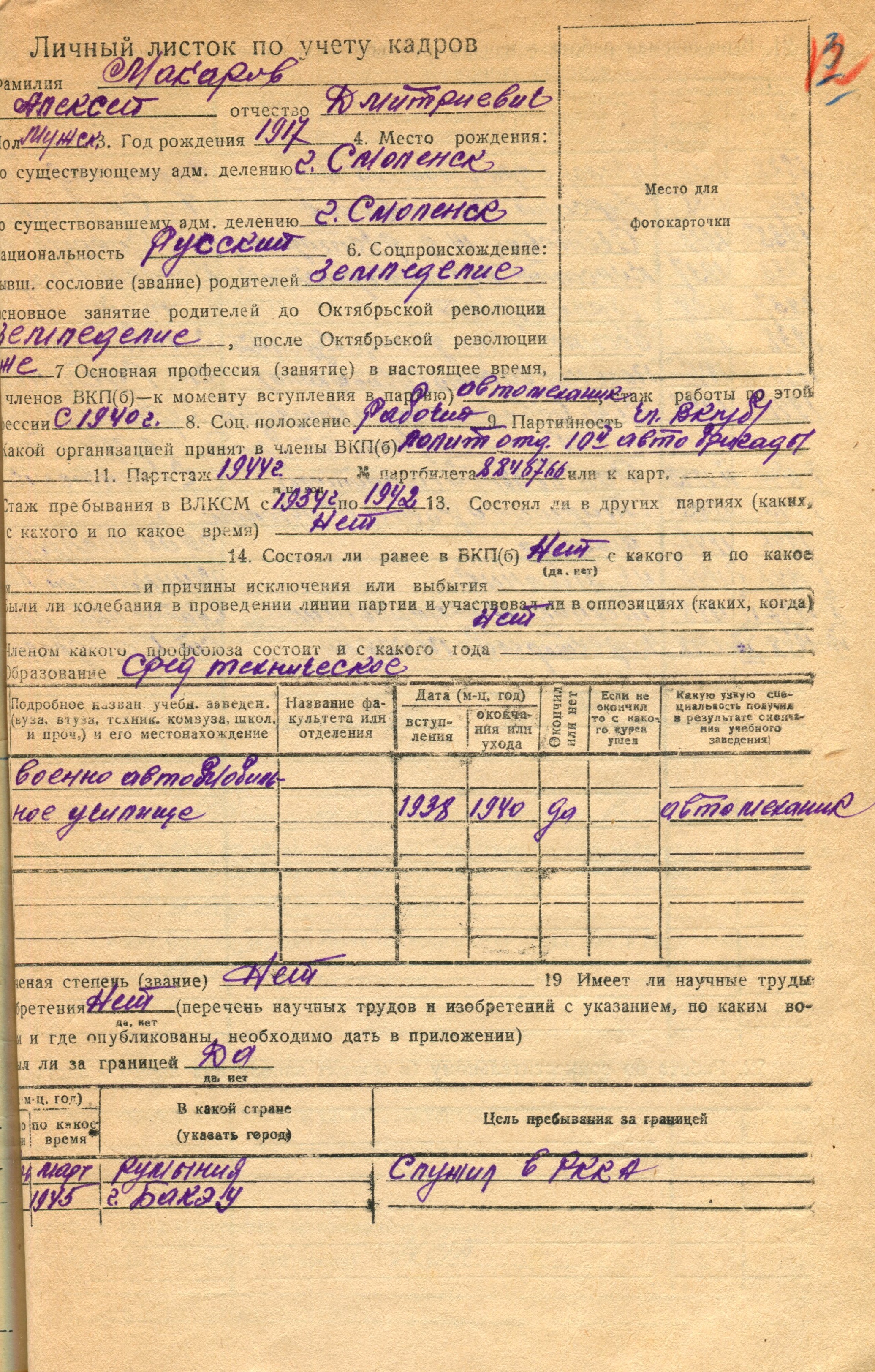 Макаров А.Д. Личный листок 1 (Ф. 324, Оп. 1-л, д. 27, л. 12)