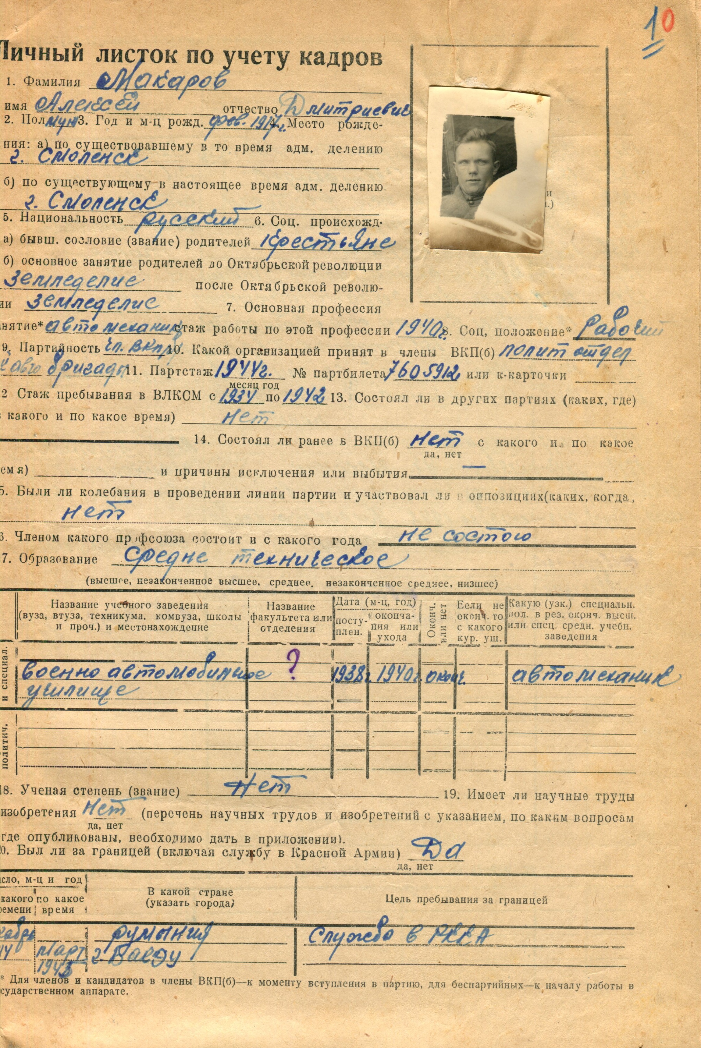Макаров А.Д. Личный листок 1 (Ф. 324, Оп. 1-л, д. 27, л. 10)