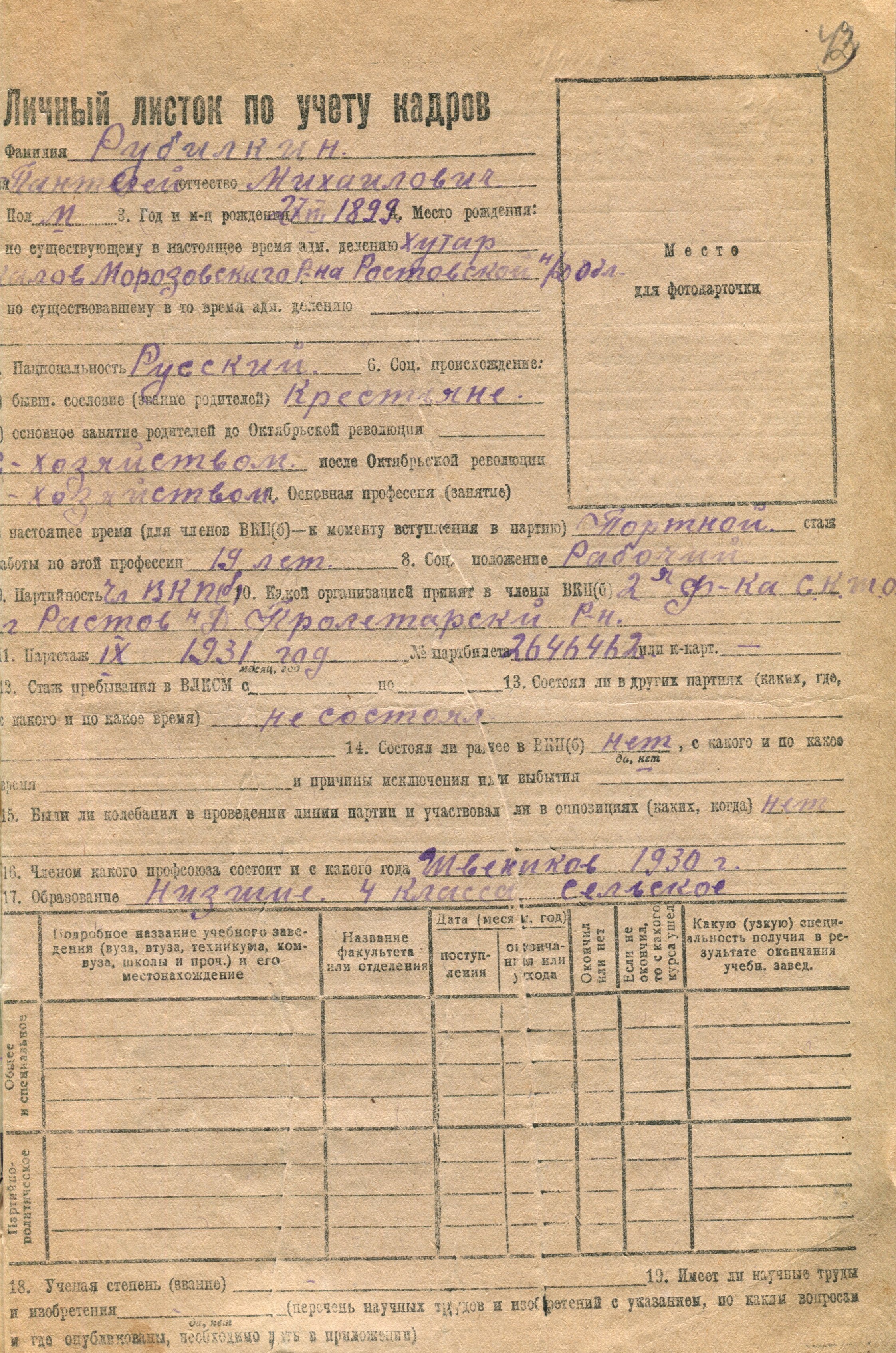 Рубилкин П.М. Личный листок 1 (Ф. 324, Оп. 1-л, д. 24, л. 43)