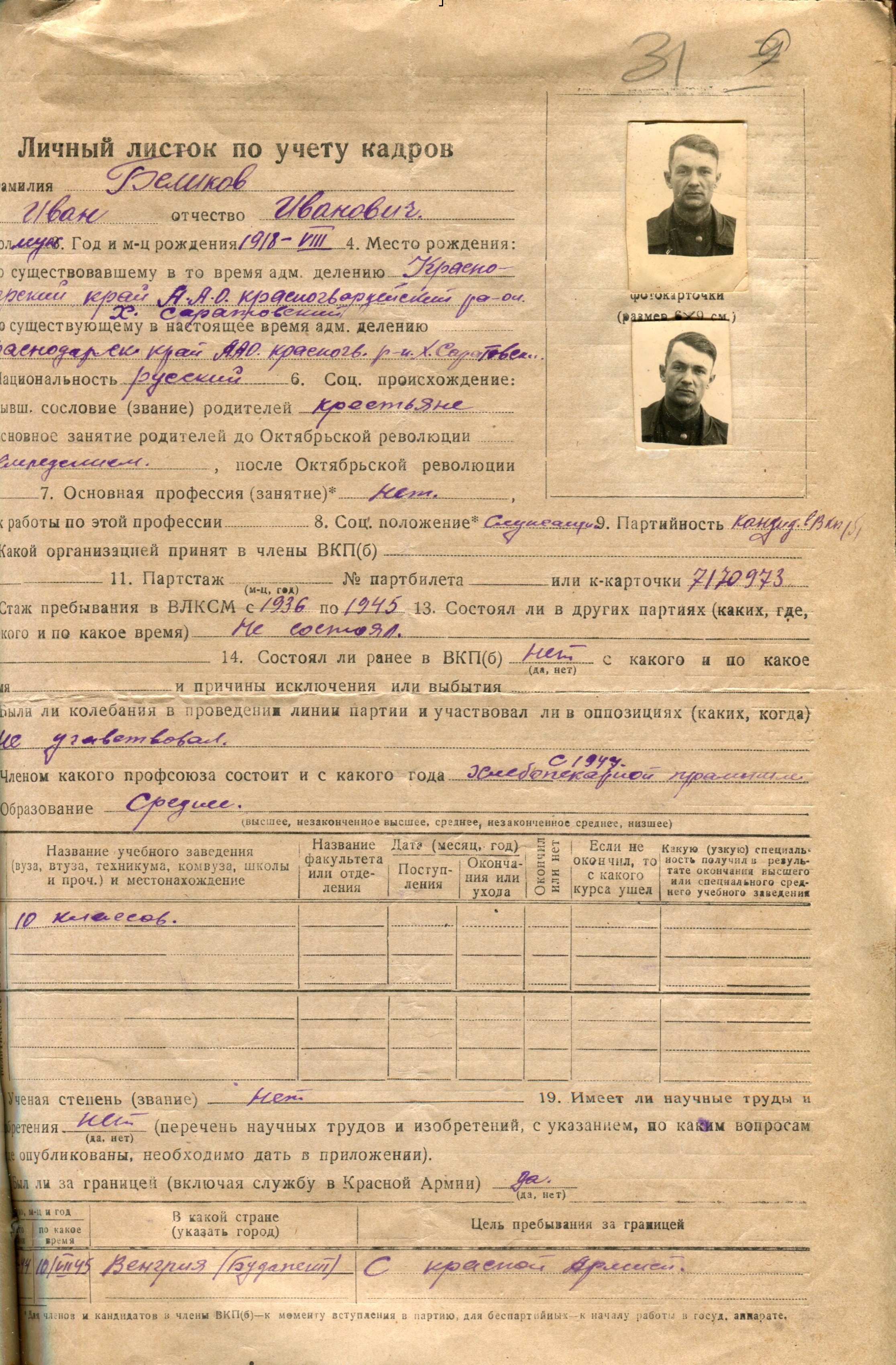 Беликов И.И. Личный листок 1 (Ф. 312, Оп. 2-л, д. 13, л.л. 31)
