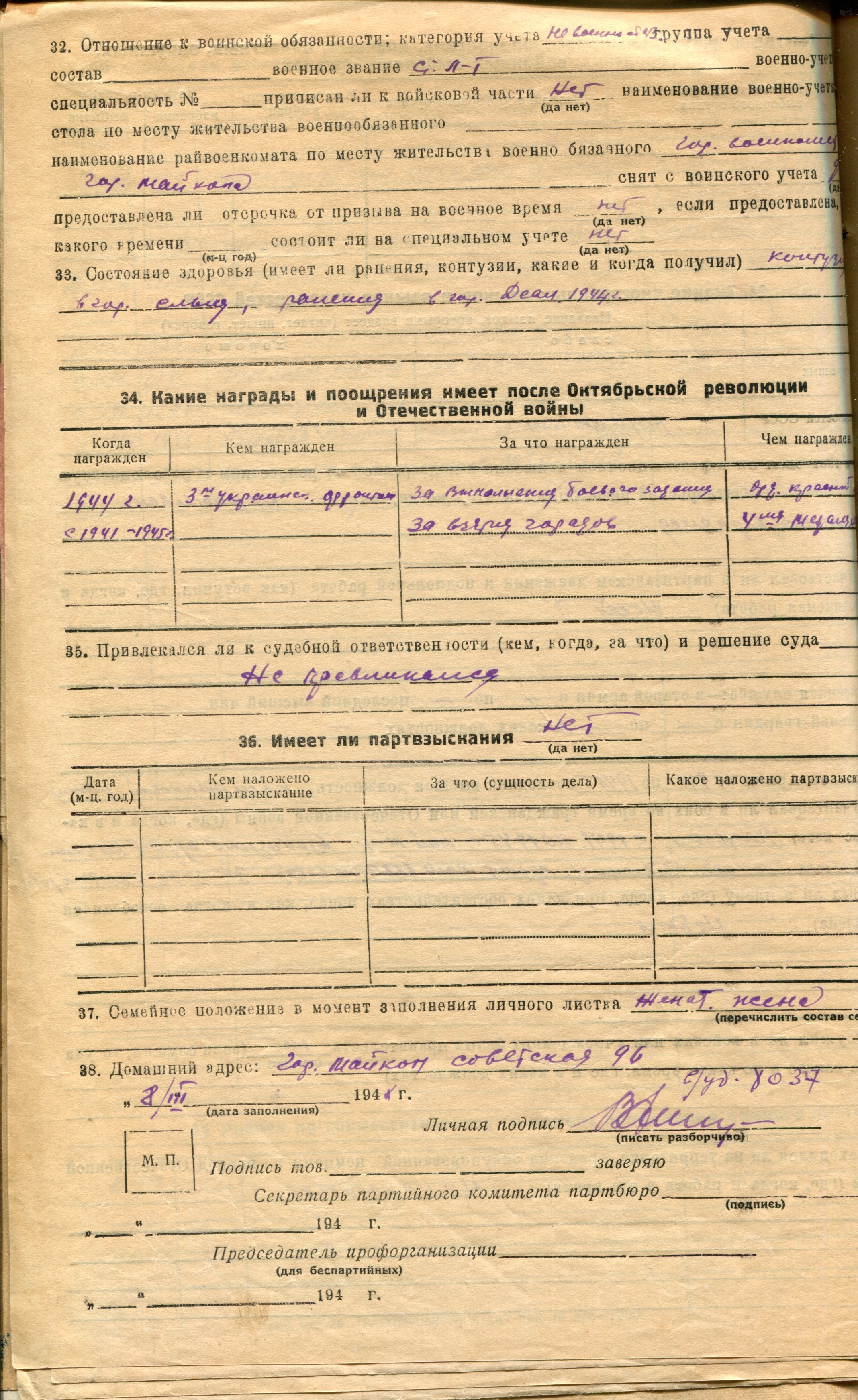 Власов Ф.Г. Личный листок 4 (Ф. 312, Оп. 2-л, д. 14, л.л. 35)