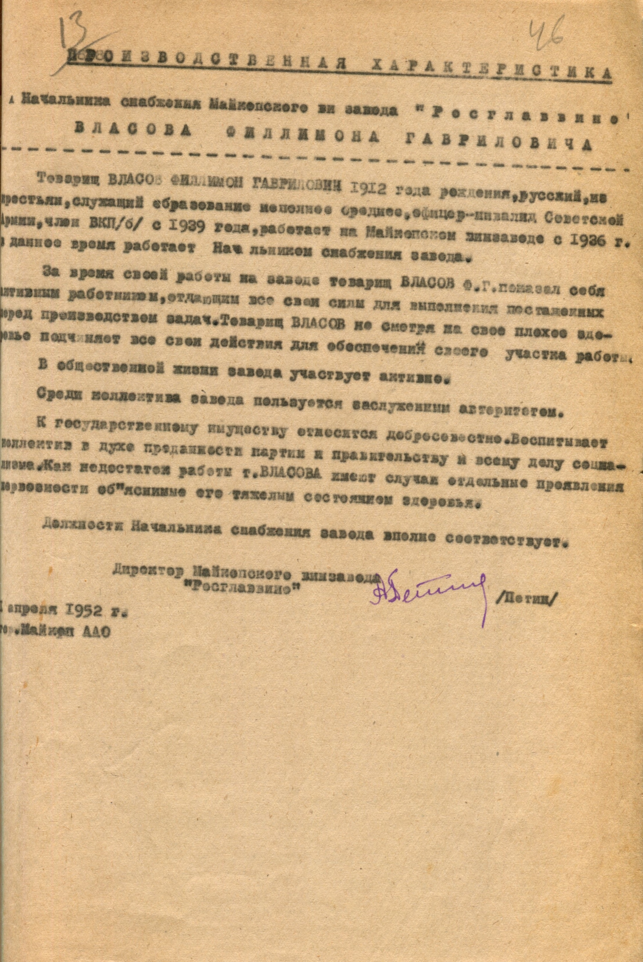 Власов Филимон Гаврилович Винно-водочный завод "Майкопский" (Ф. 312, Оп. 2-л, д. 14)