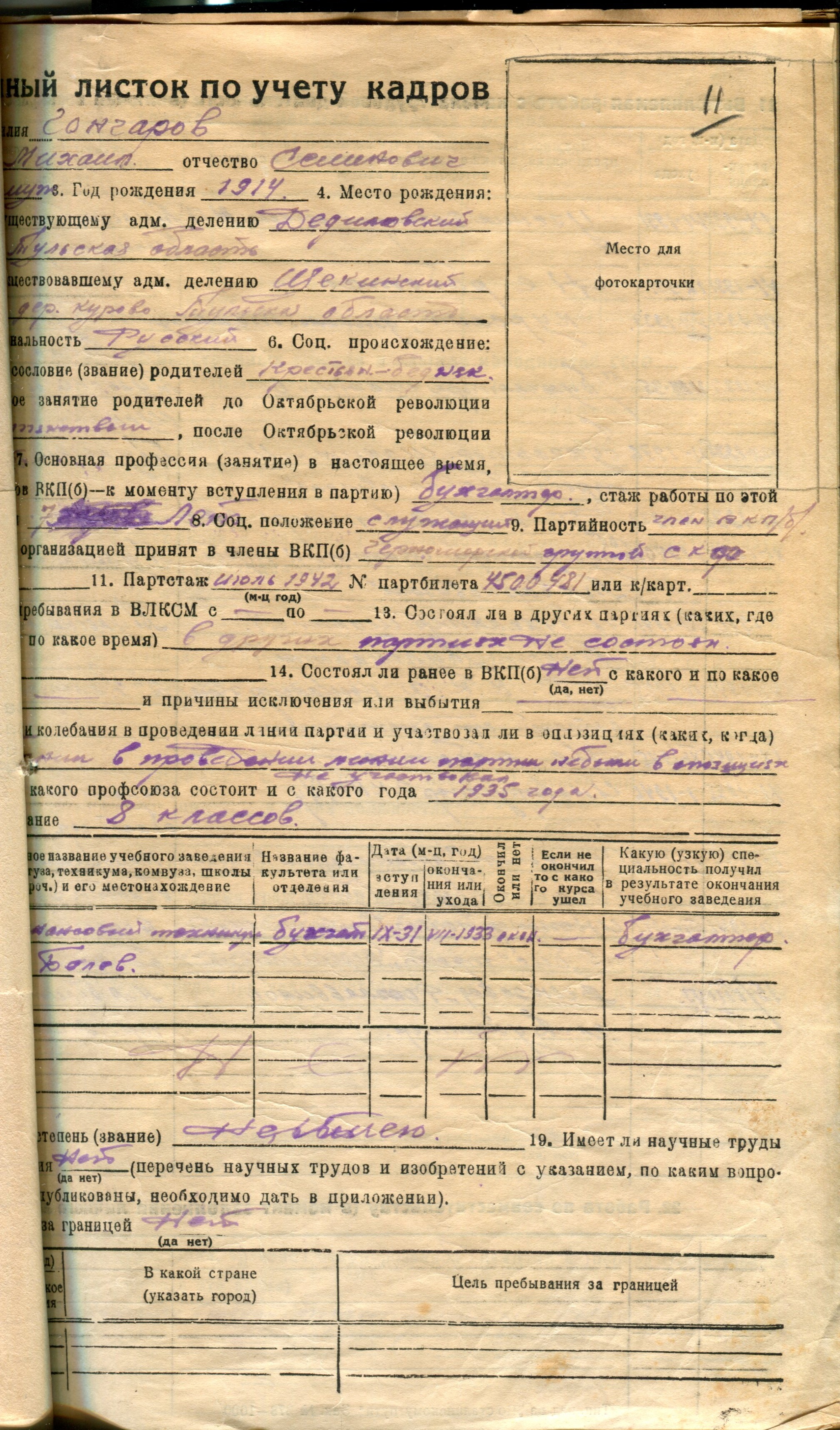 Гончаров М.С. Личный листок 1 (Ф. 312, Оп. 2-л, д. 15, л.л. 11)