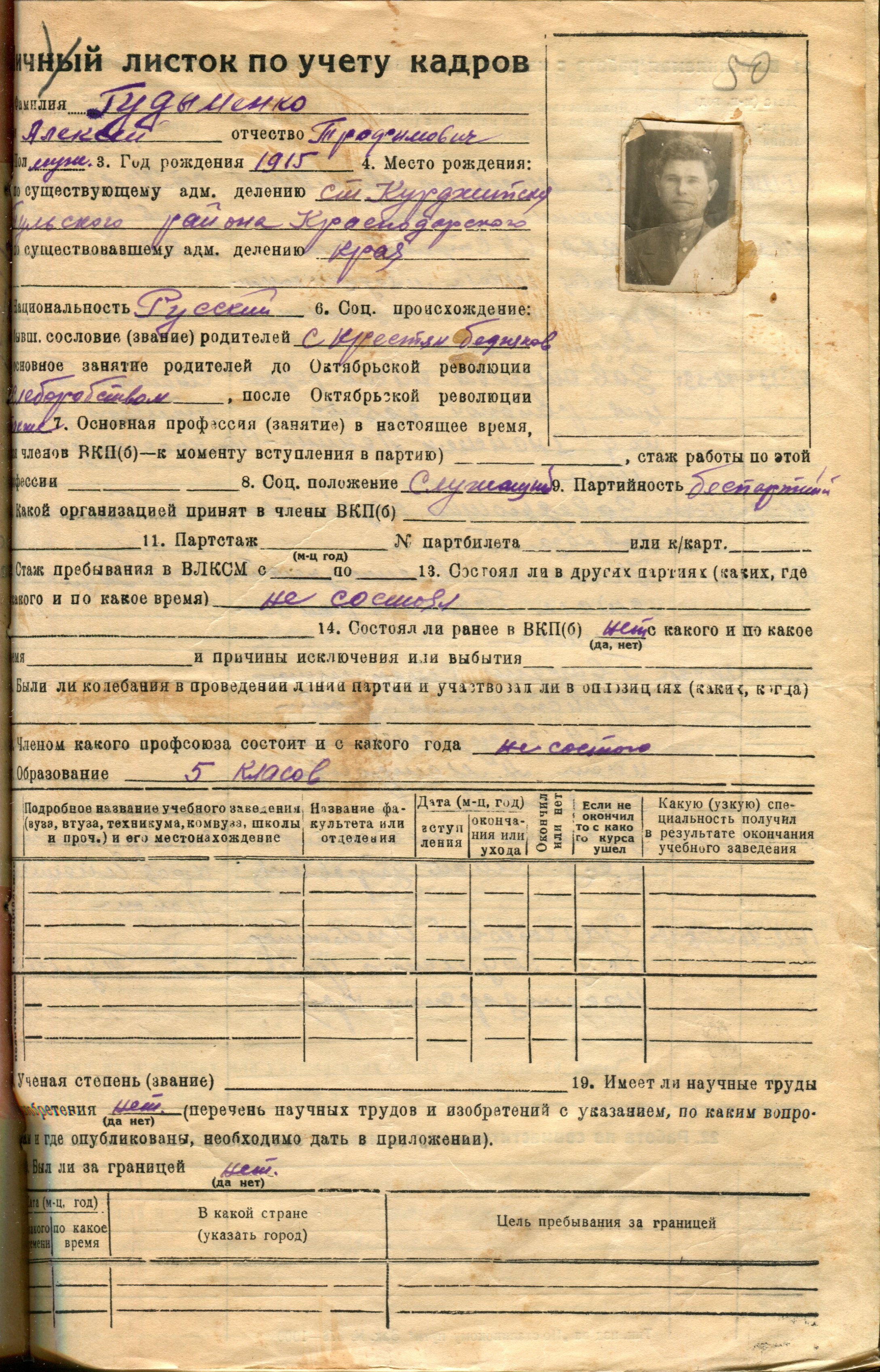Гудыменко А.Т. Личный листок 1 (Ф. 312, Оп. 2-л, д. 14, л.л. 50)