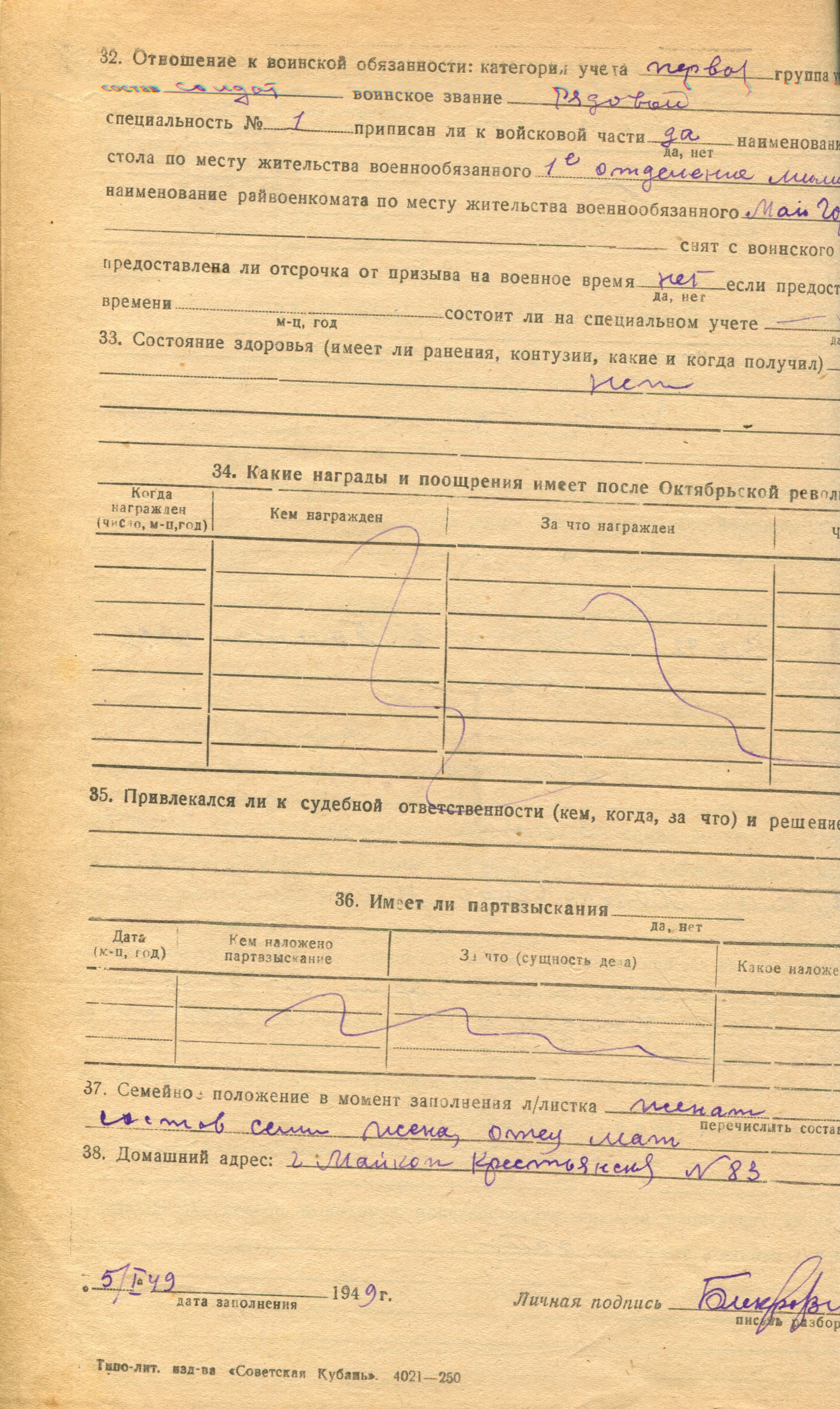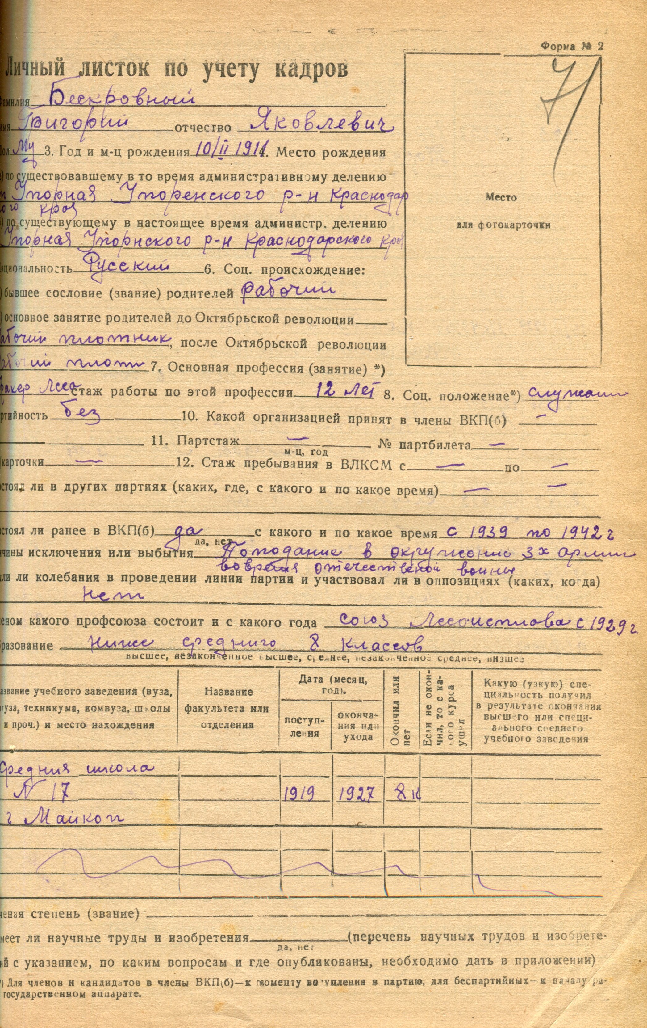 Бескровный Г.Я. Личный листок 1 (Ф. 346, Оп. 1-л, д. 26, л. 71)