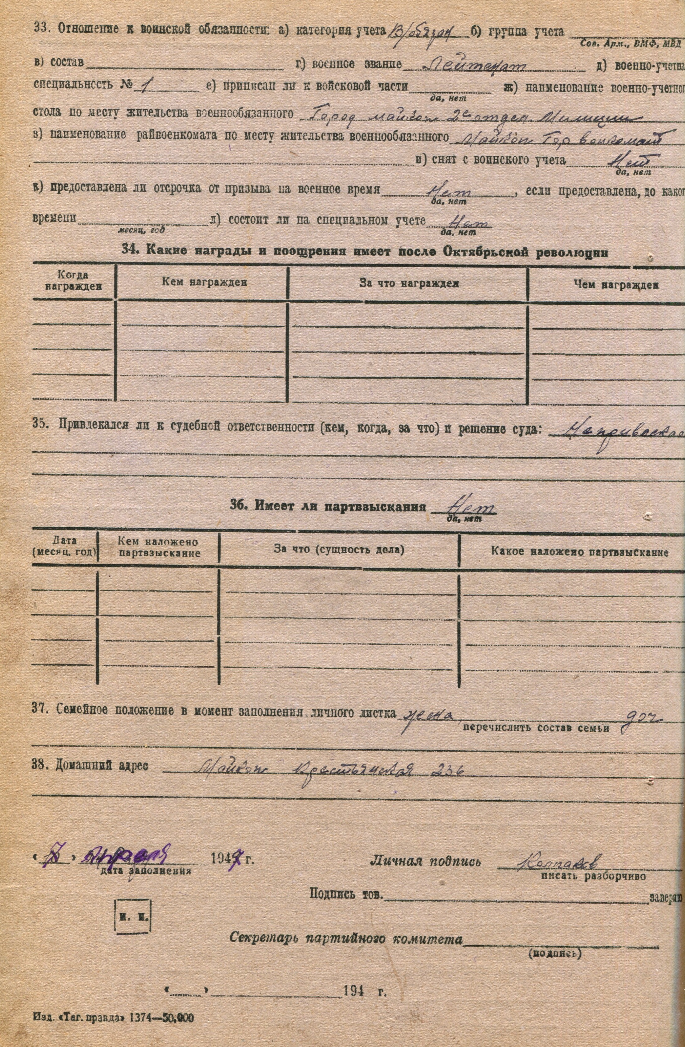 Колпаков Н.И. Личный листок 2 (Ф. 346, Оп. 1-л, д. 26, л. 235)