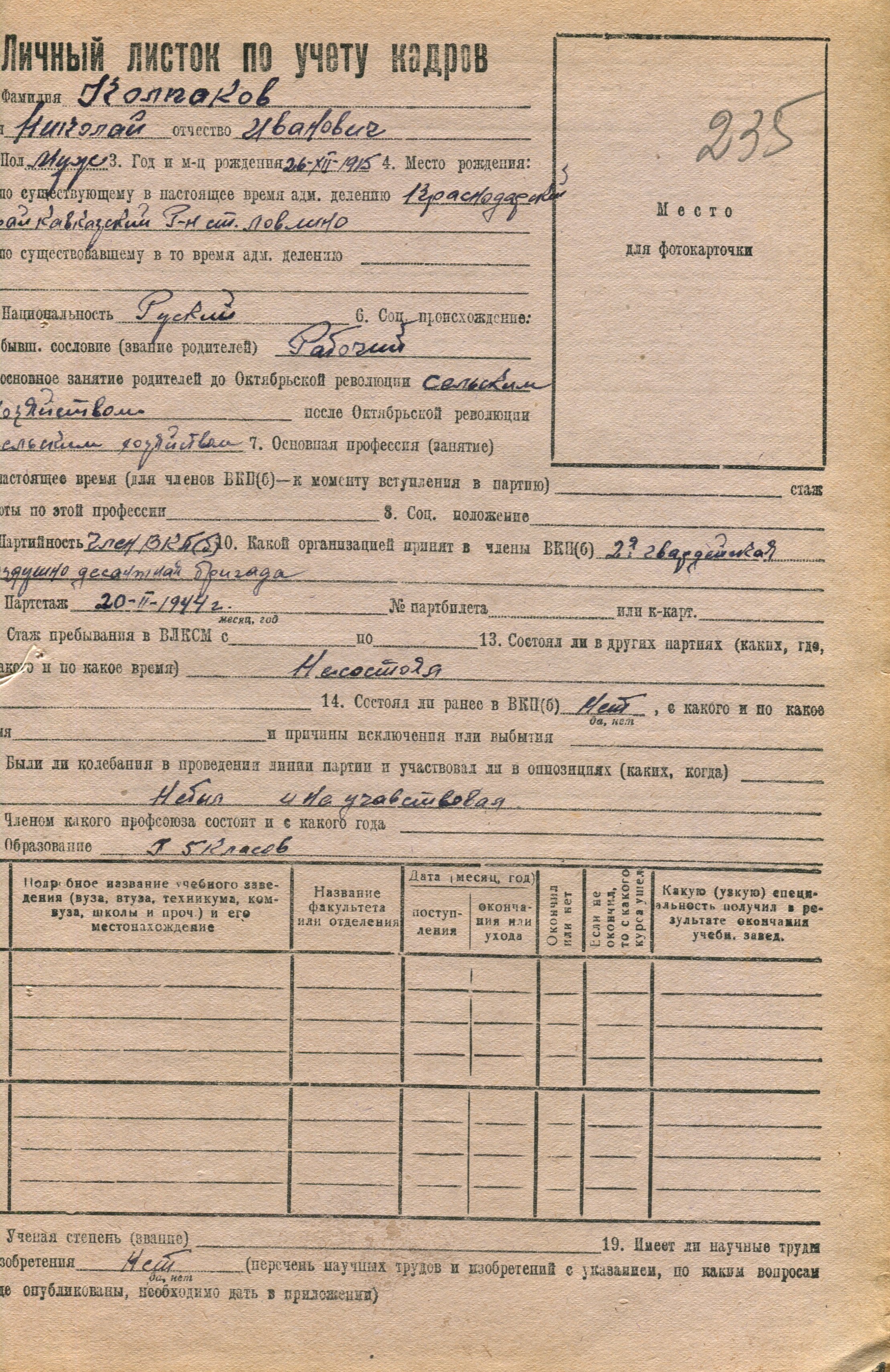 Колпаков Н.И. Личный листок 1 (Ф. 346, Оп. 1-л, д. 26, л. 235)