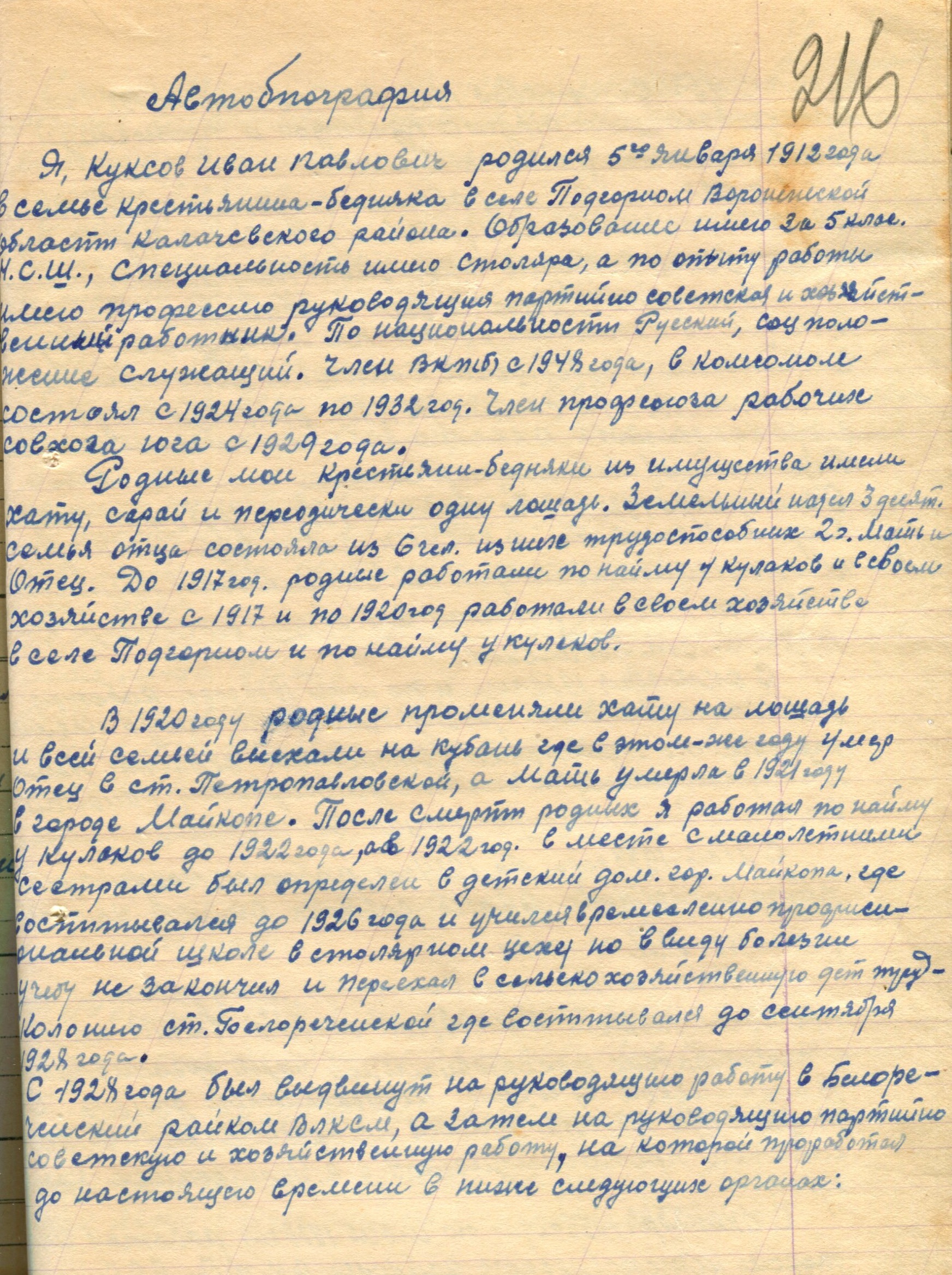 Кусков И.П. Автобиография 1 (Ф. 346, Оп. 1-л, д. 26, л. 216)