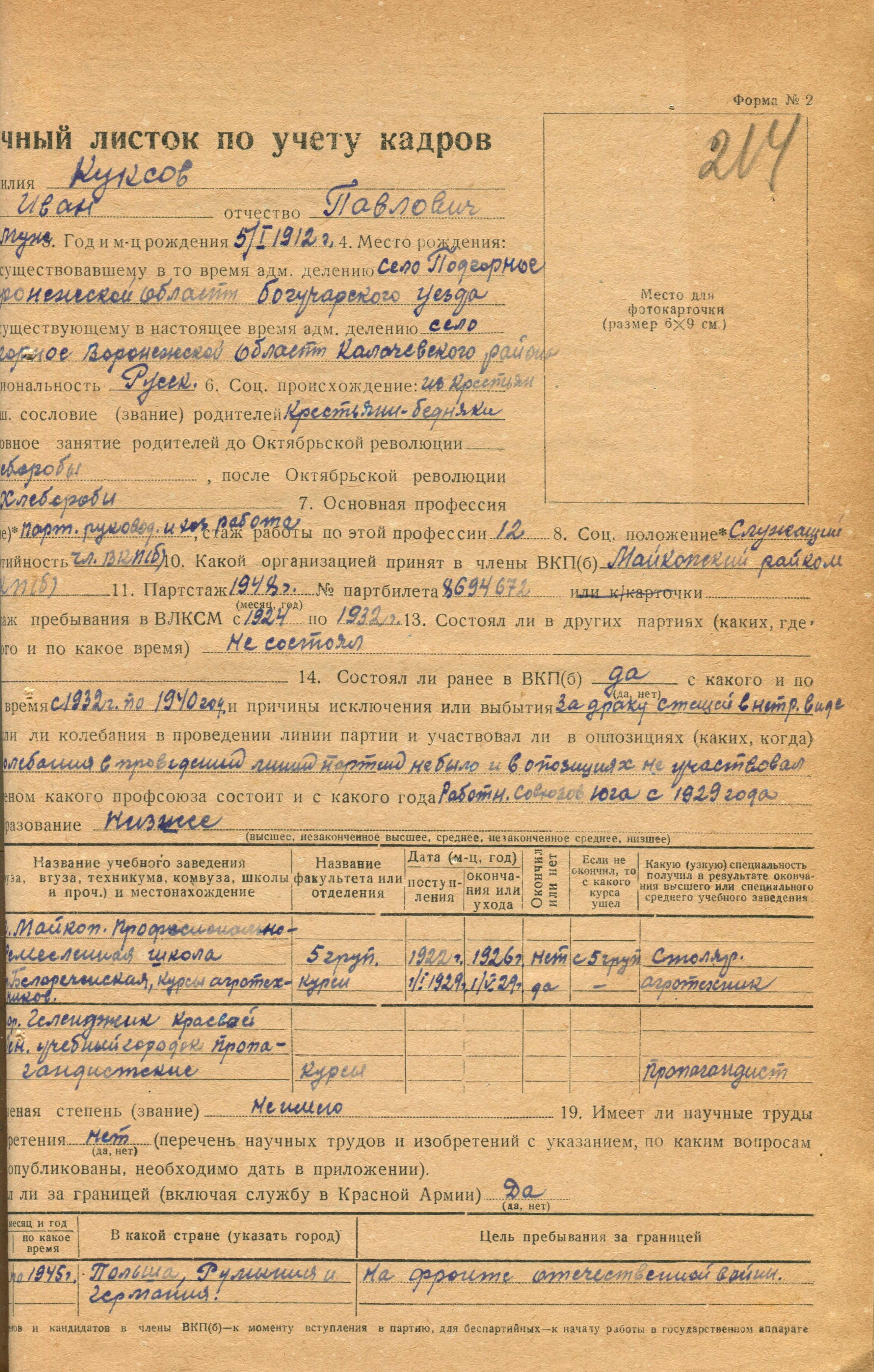 Кусков И.П. Личный листок 1 (Ф. 346, Оп. 1-л, д. 26, л. 214)