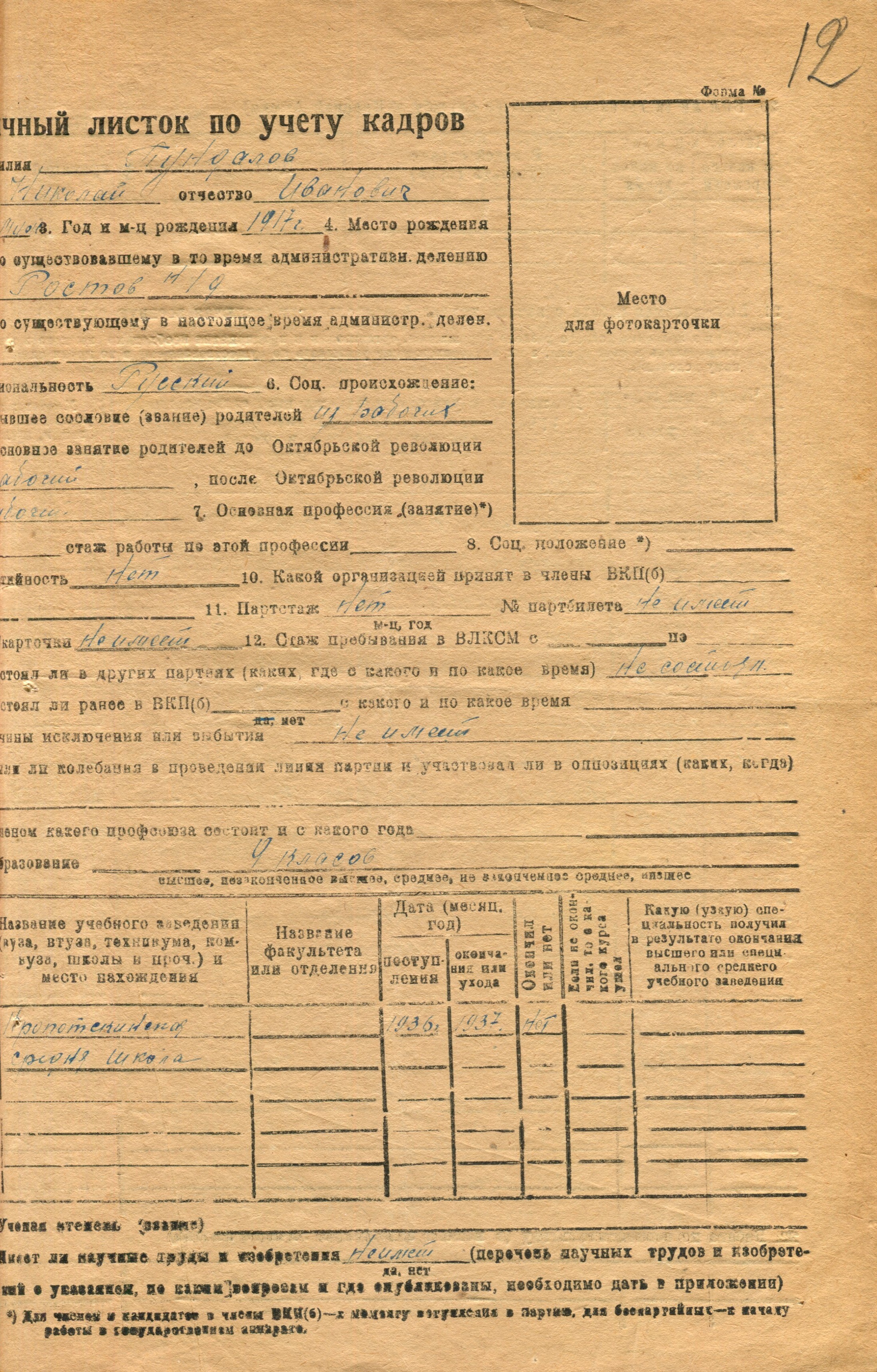 Пундалов Н.И. Личный листок 1 (Ф. 346, Оп. 1-л, д. 26, л. 12)