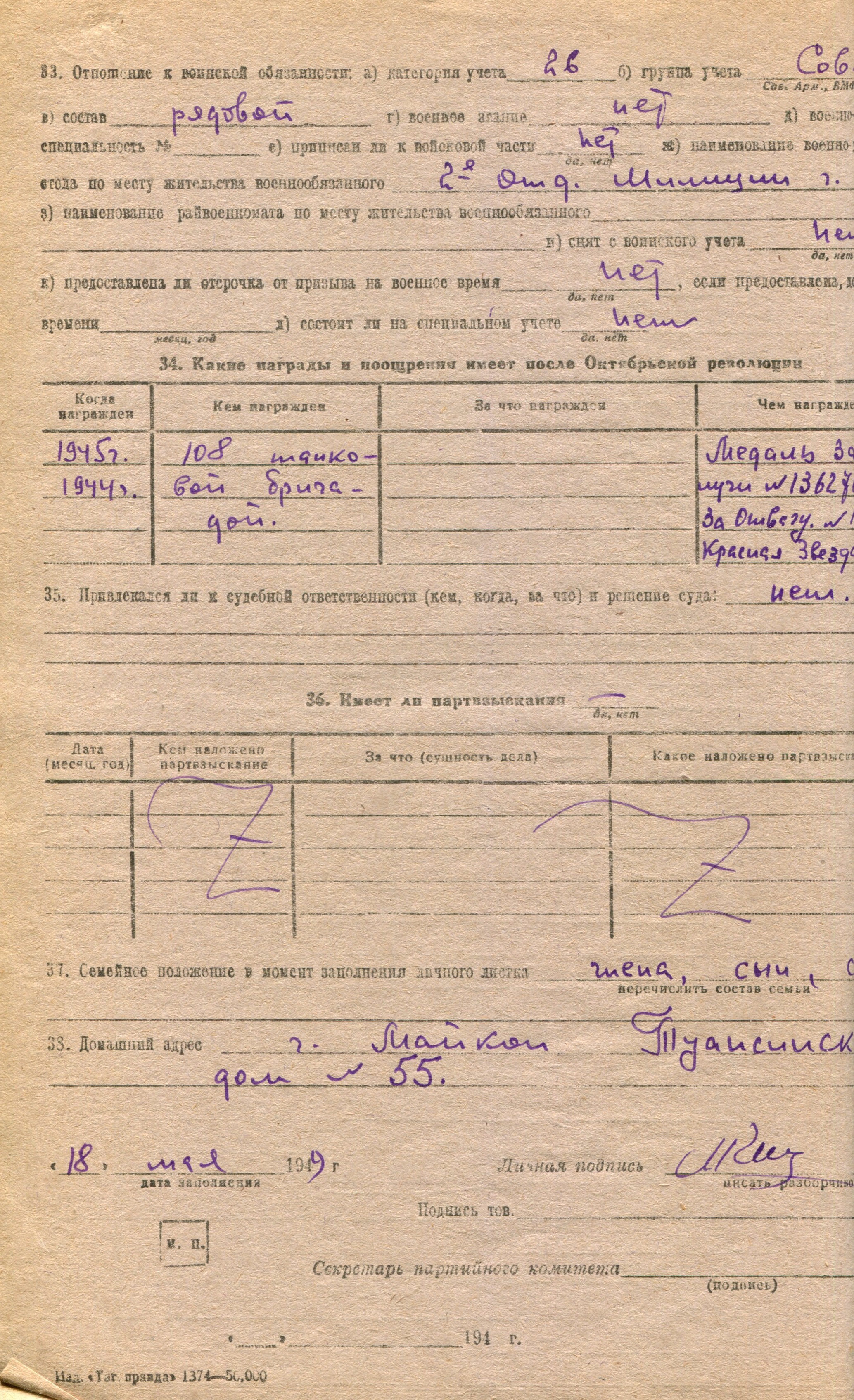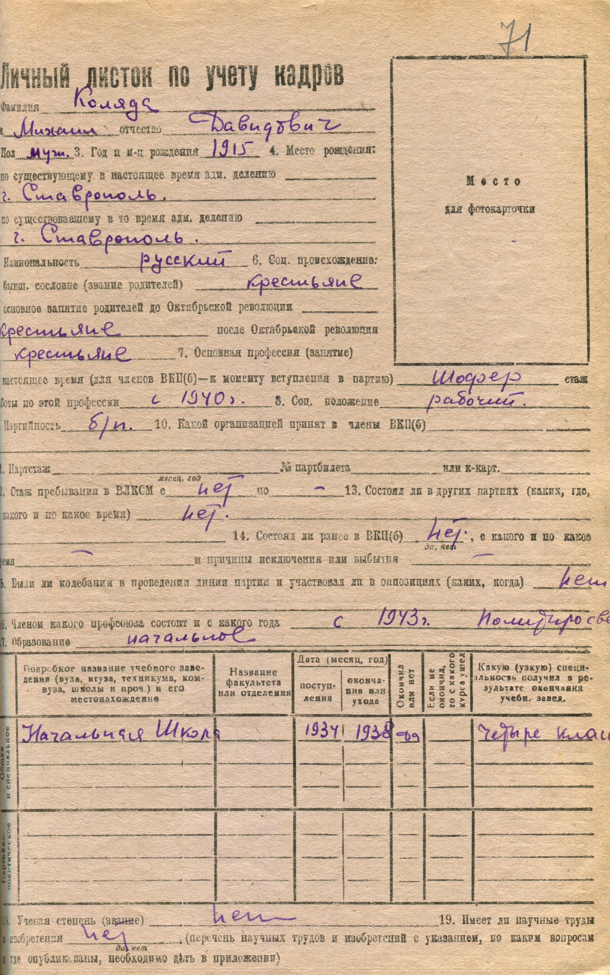 Коляда М. Д. Личный листок 1 (Ф. 341, Оп. 1-л, д. 3, л. 71)