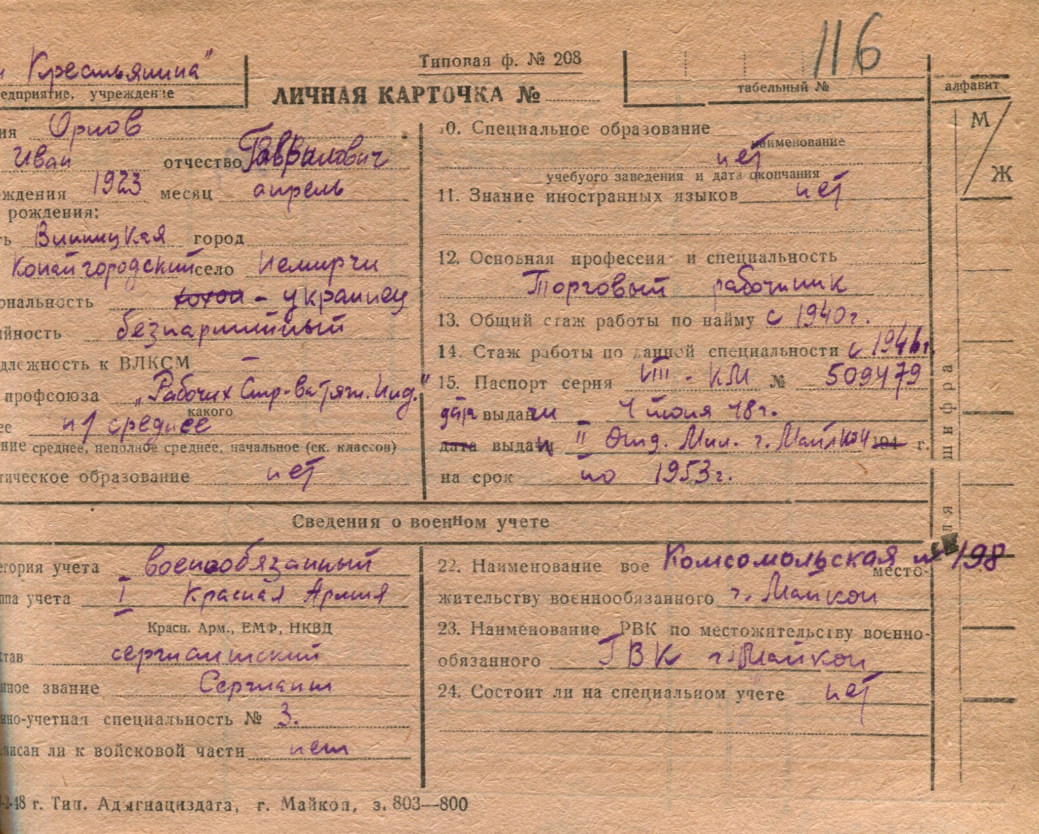 Орлов И.Г. Личная карточка 1 (Ф. 341, Оп. 1, д. 3, л. 116)