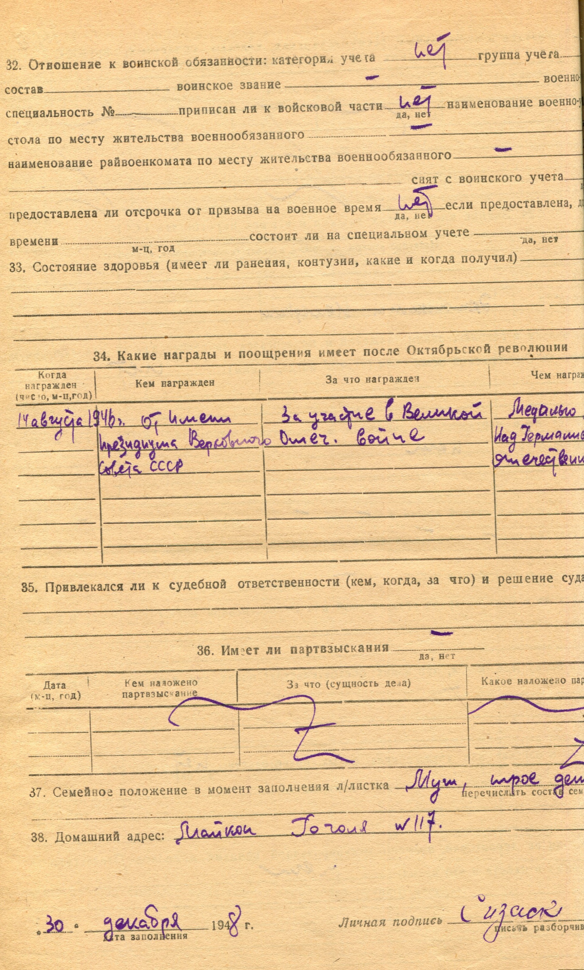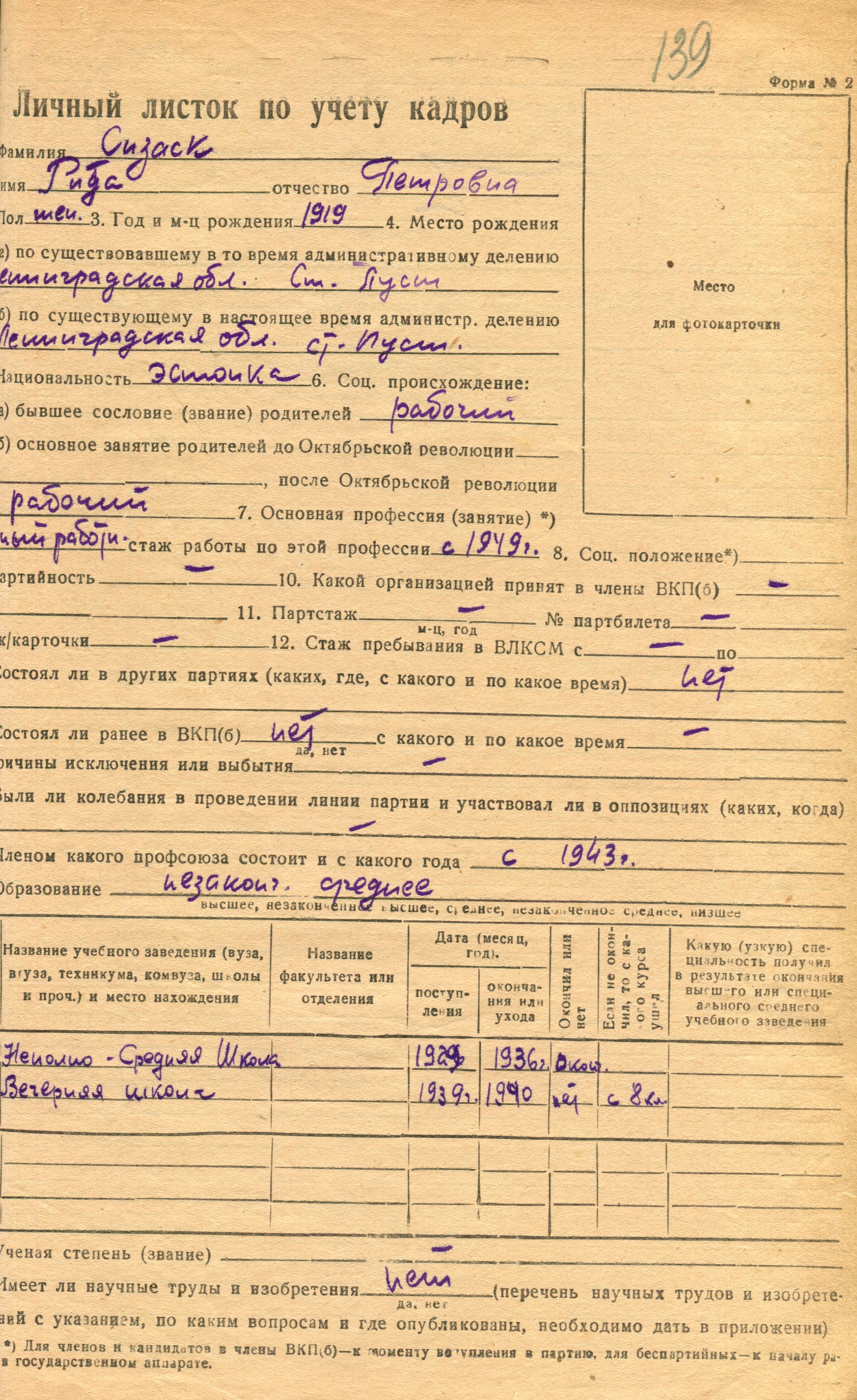 Сизаск Р. П. Личный листок 2 (Ф. 341, Оп. 1-л, д. 3, л. 139)