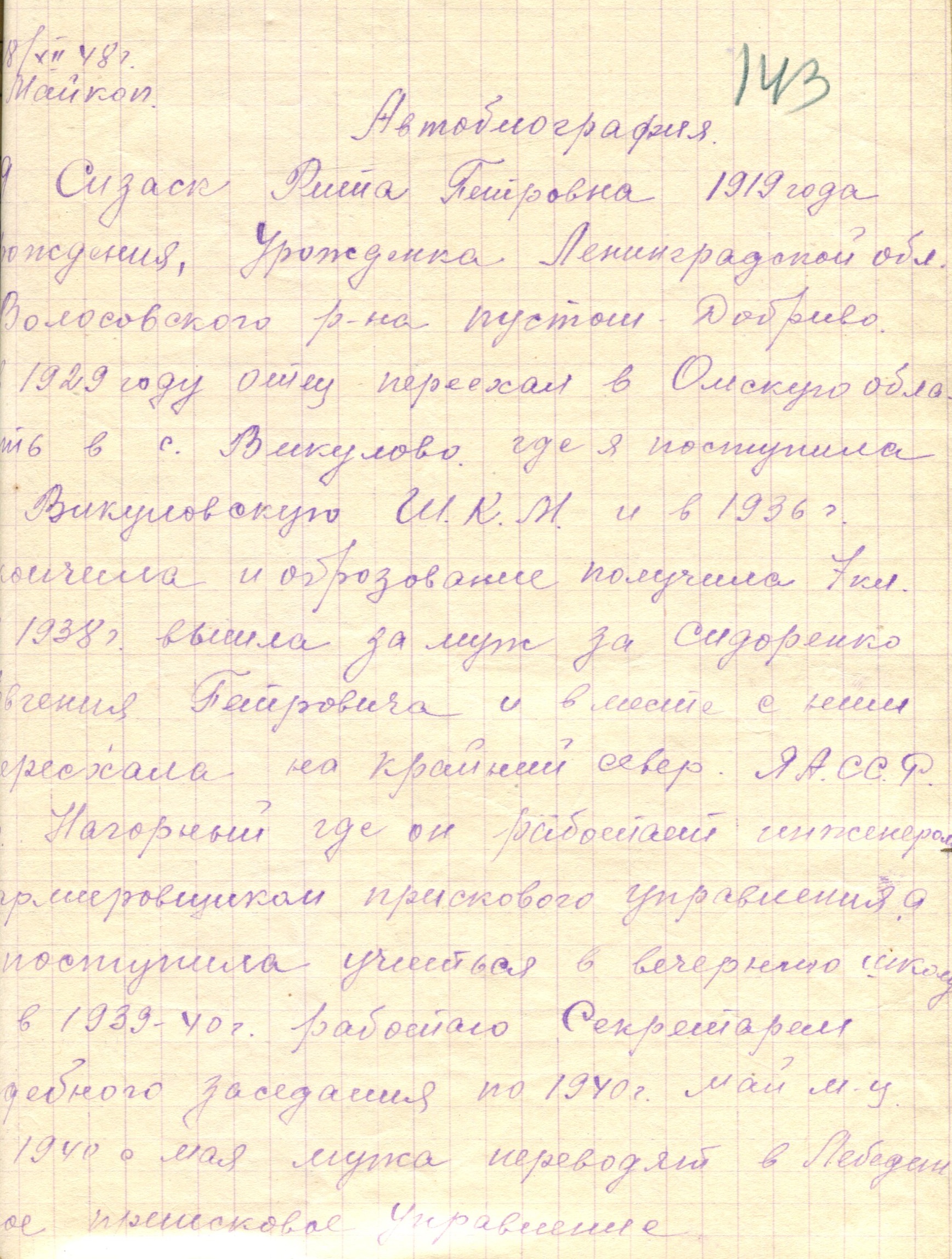 Сизаск Р. П. Автобиография 1 (Ф. 341, Оп. 1-л, д. 3, л. 143)