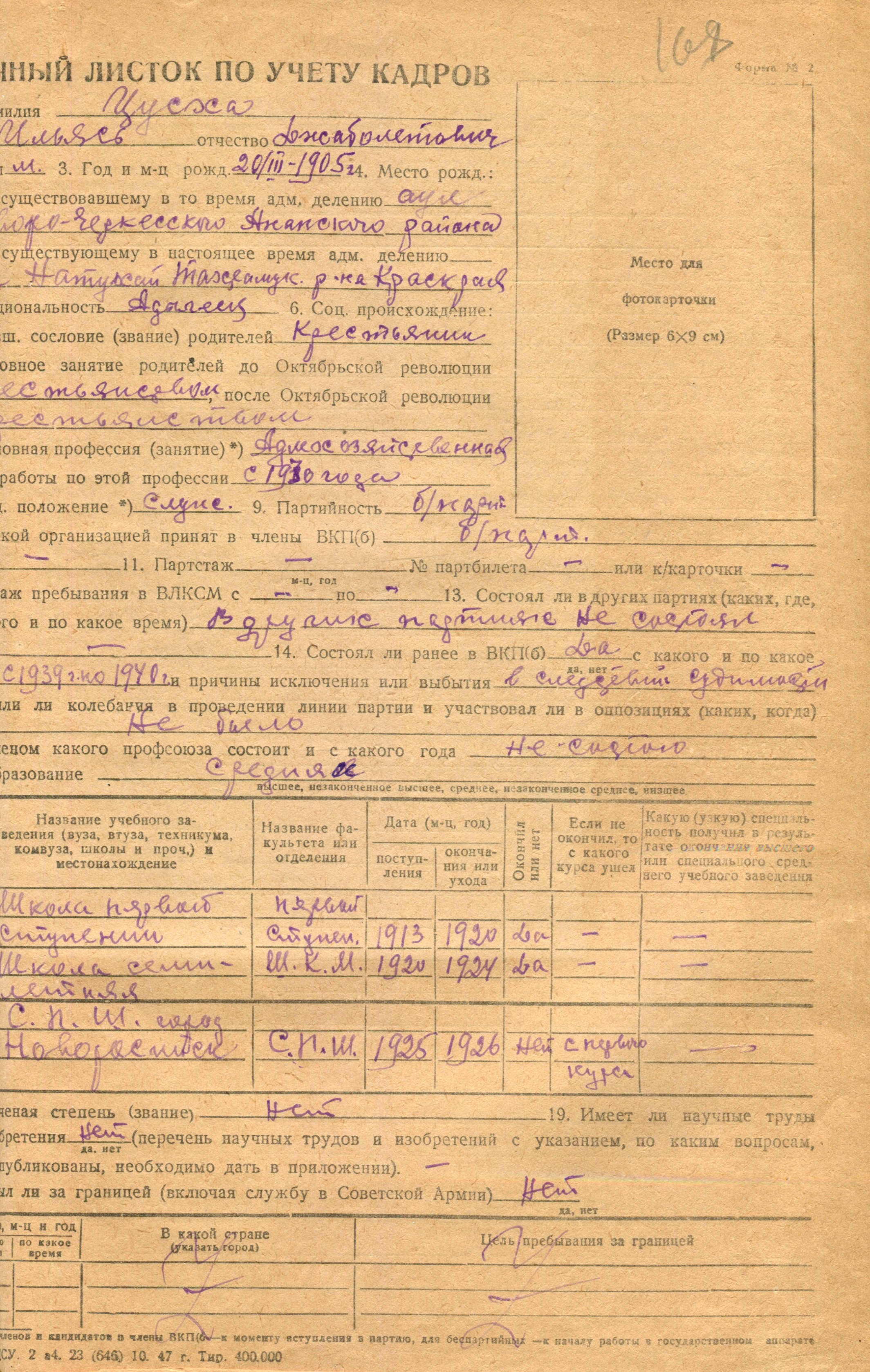 Цусха И. Д. Личный листок 1 (Ф. 341, Оп. 1, д. 3, л. 168)