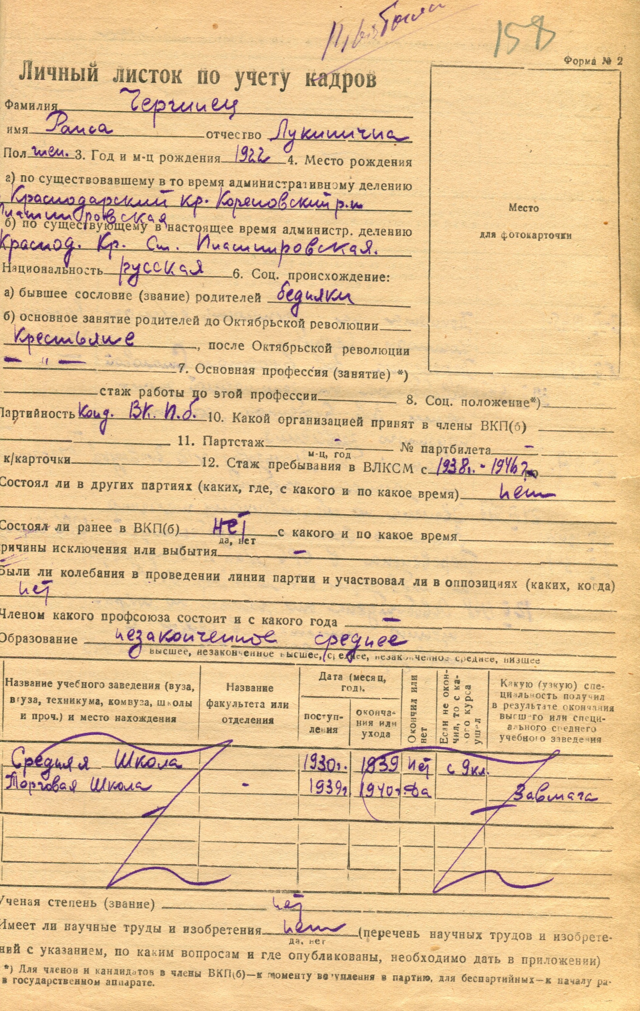 Чергенец Р. Л. Личный листок 2 (Ф. 341, Оп. 1-л, д. 3, л. 158)