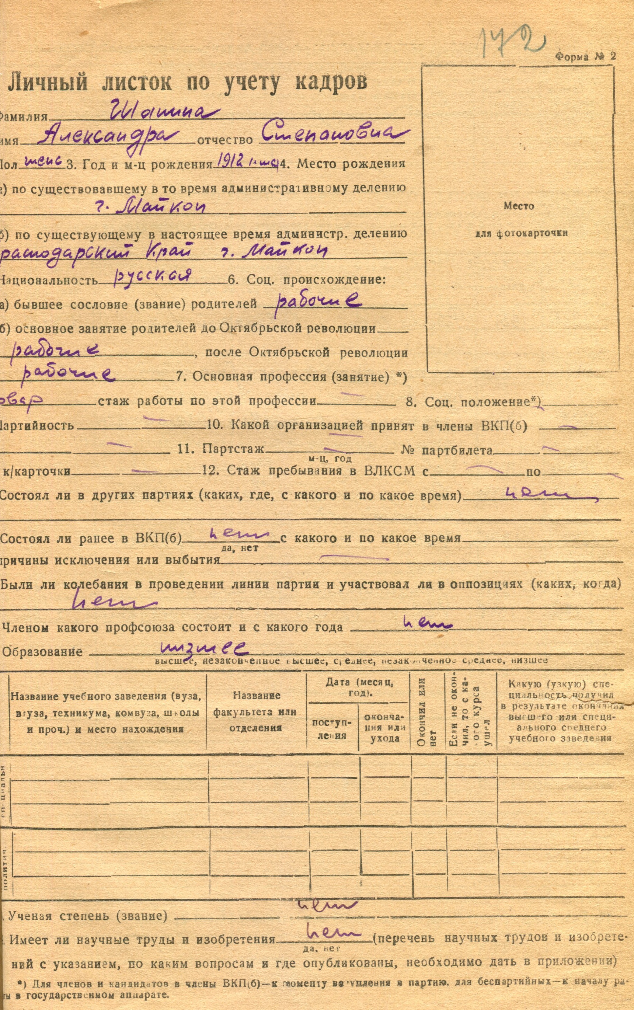 Шанина А.С. Личный листок 1 (Ф. 341, Оп. 1, д. 3, л. 172)