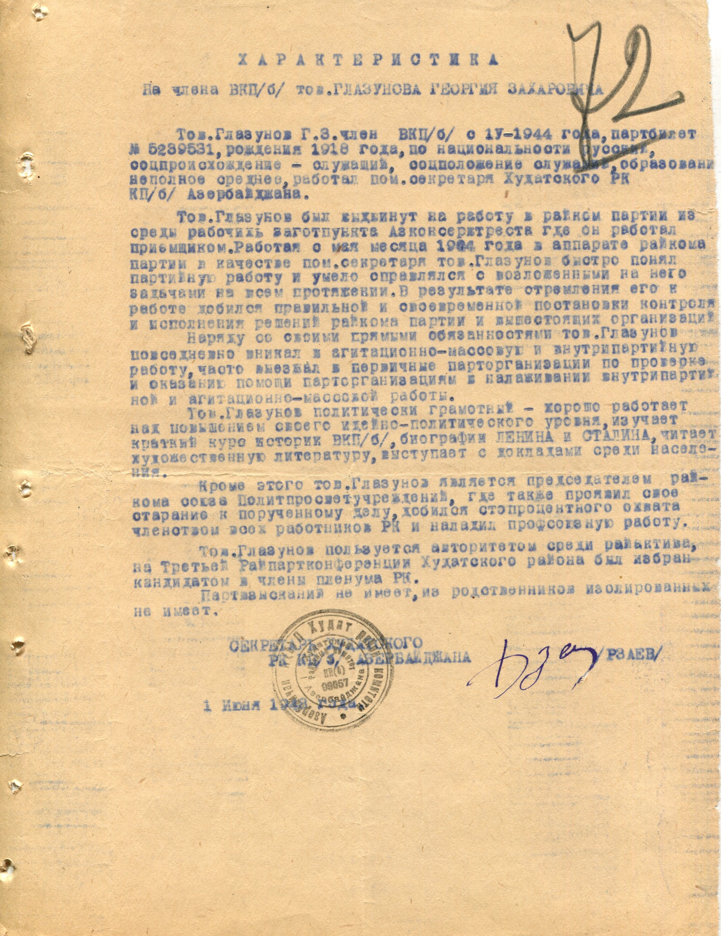 Глазунов Г.З. Характеристика (Ф. 305, Оп. 1-л, д. 29, л. 72)
