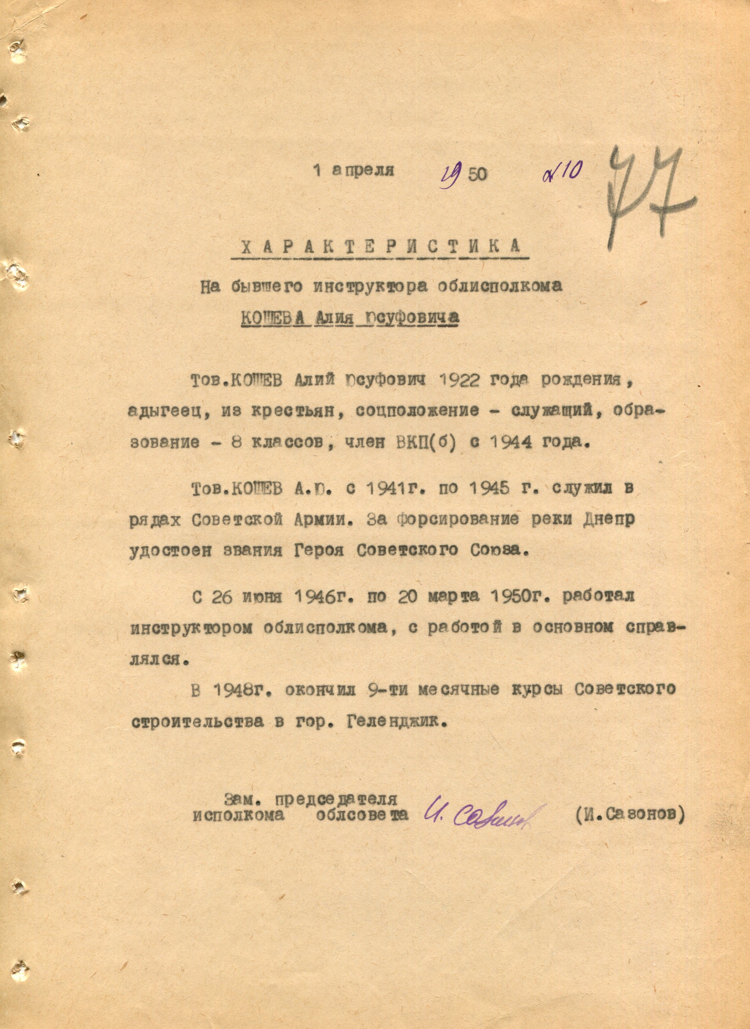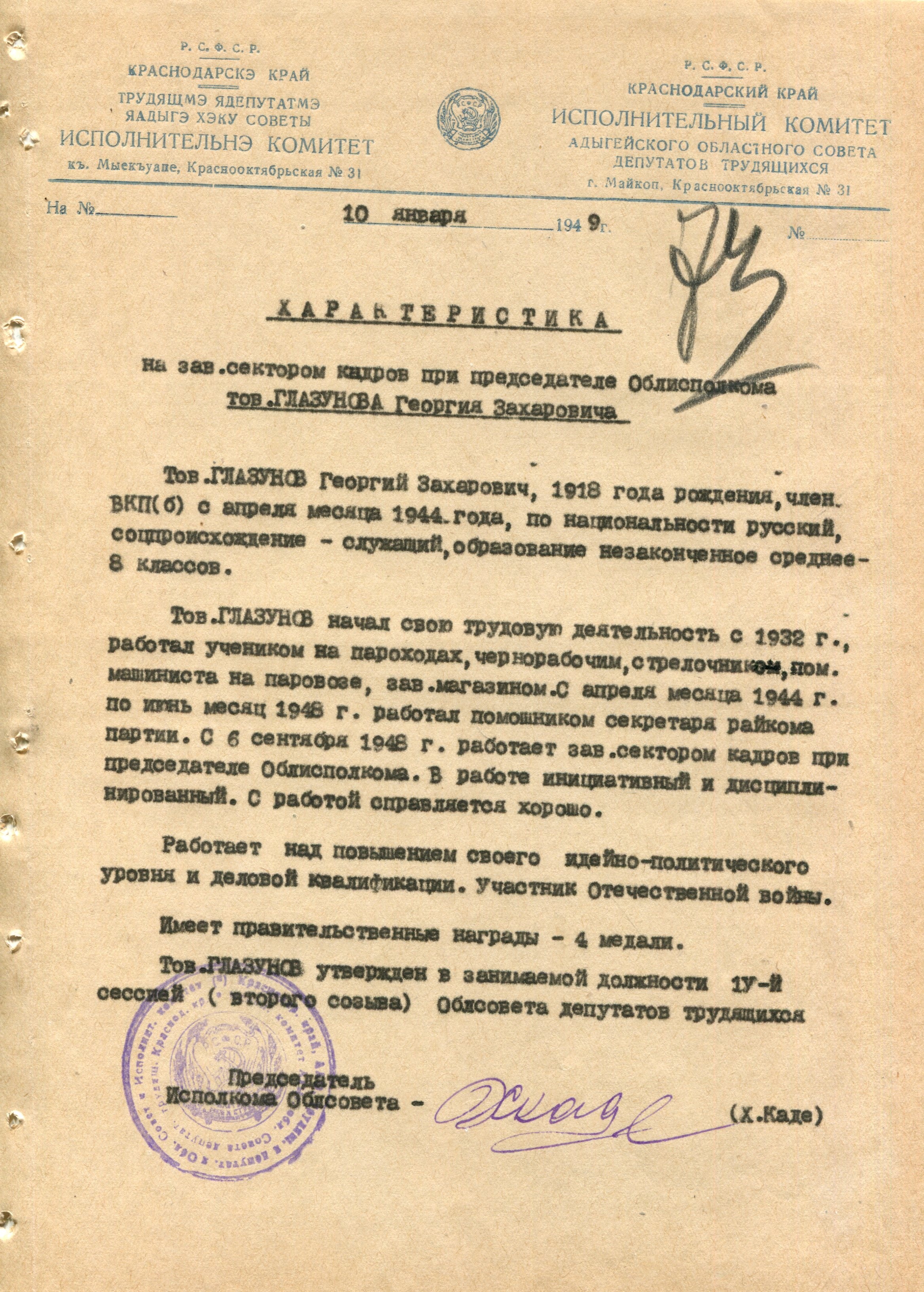 Глазунов Георгий Захарович Исполком народных депутатов ССР Адыгея (Ф. 305, Оп. 1-л, д. 29)