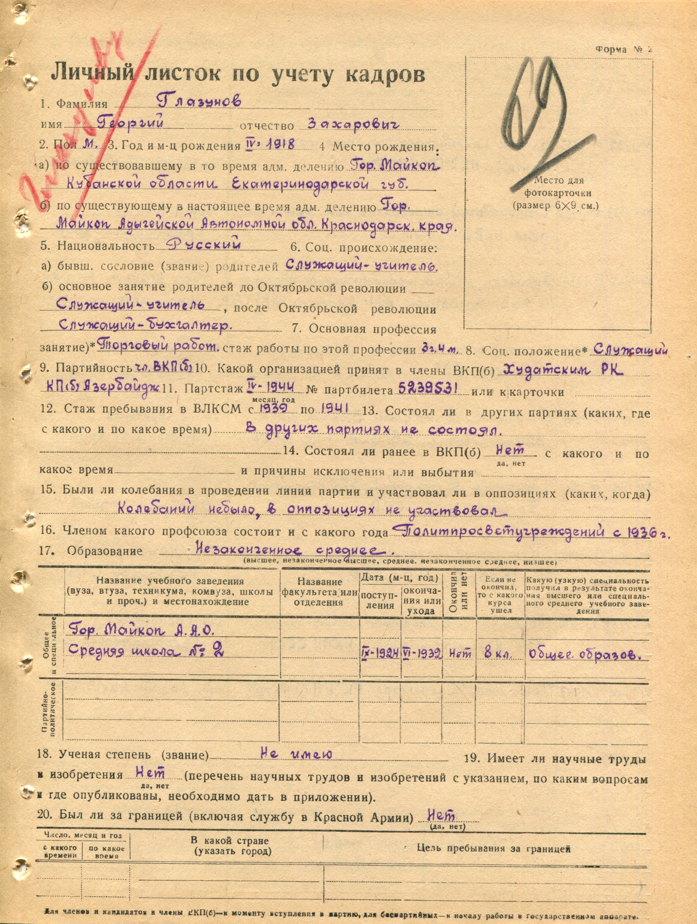 Глазунов Г.З. Личный листок 2 (Ф. 305, Оп. 1-л, д. 29, л. 69)