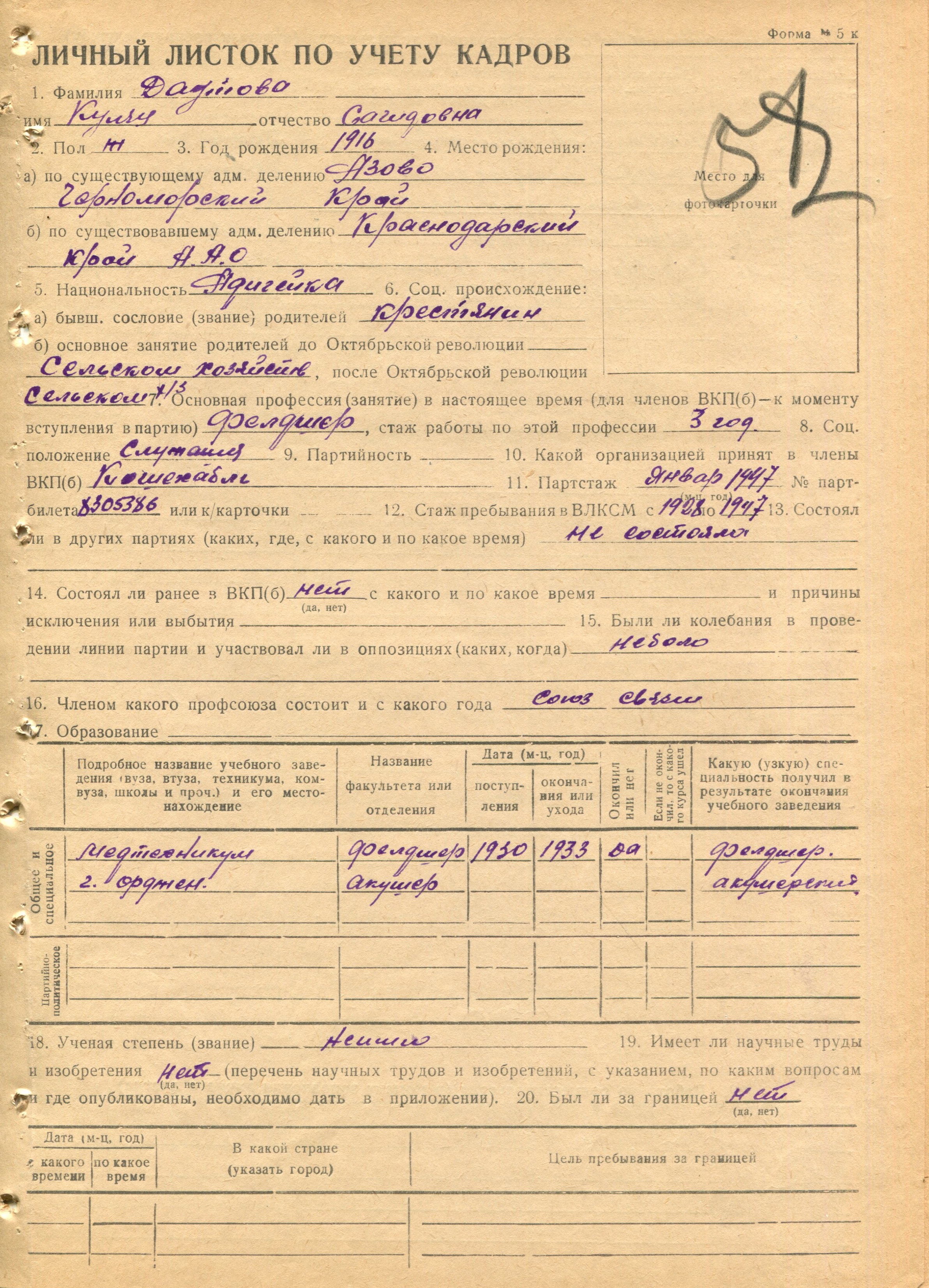 Даутова К. С. Личный листок 1 (Ф. 305, Оп. 1-л, д. 29, л. 58)