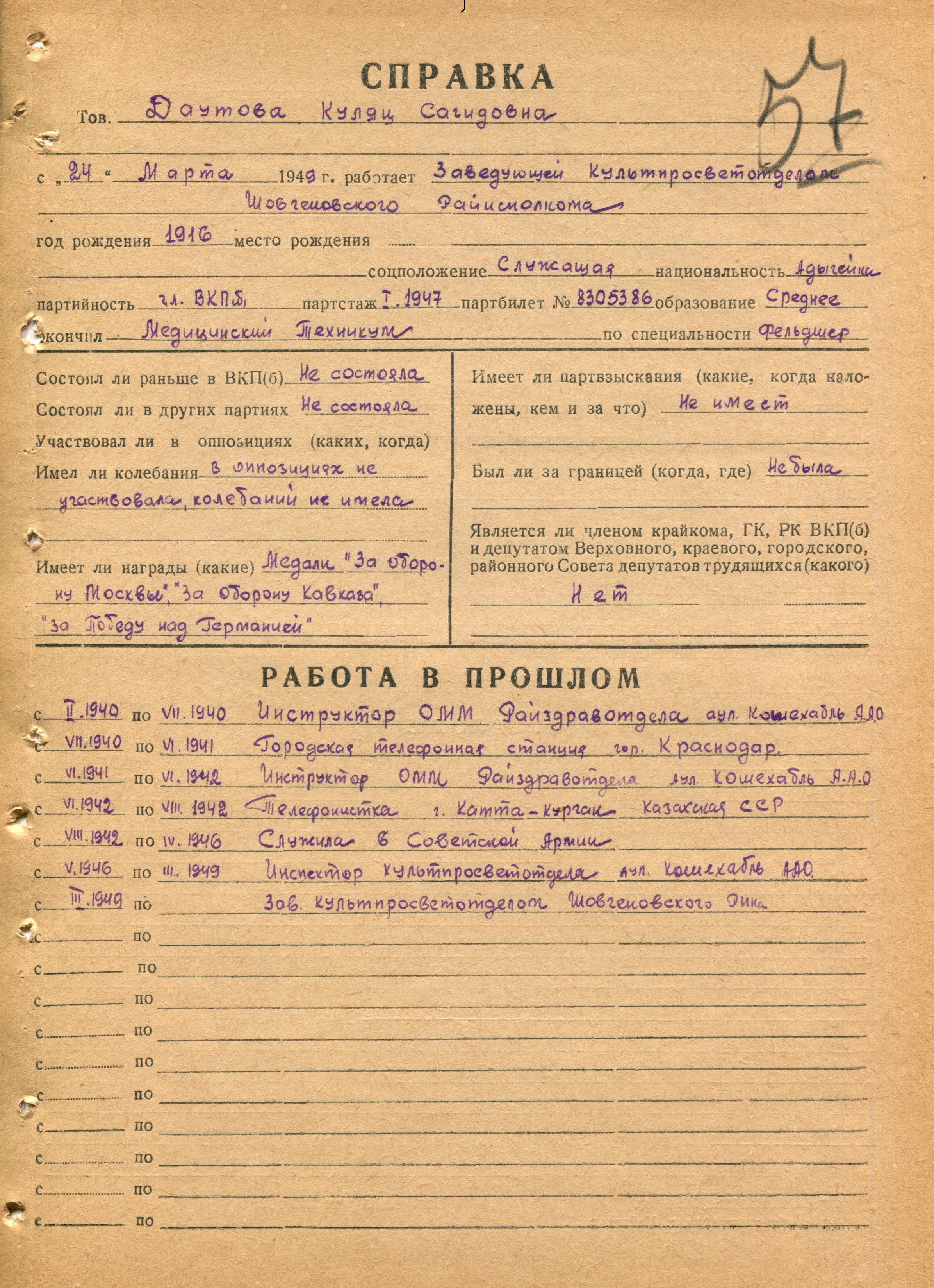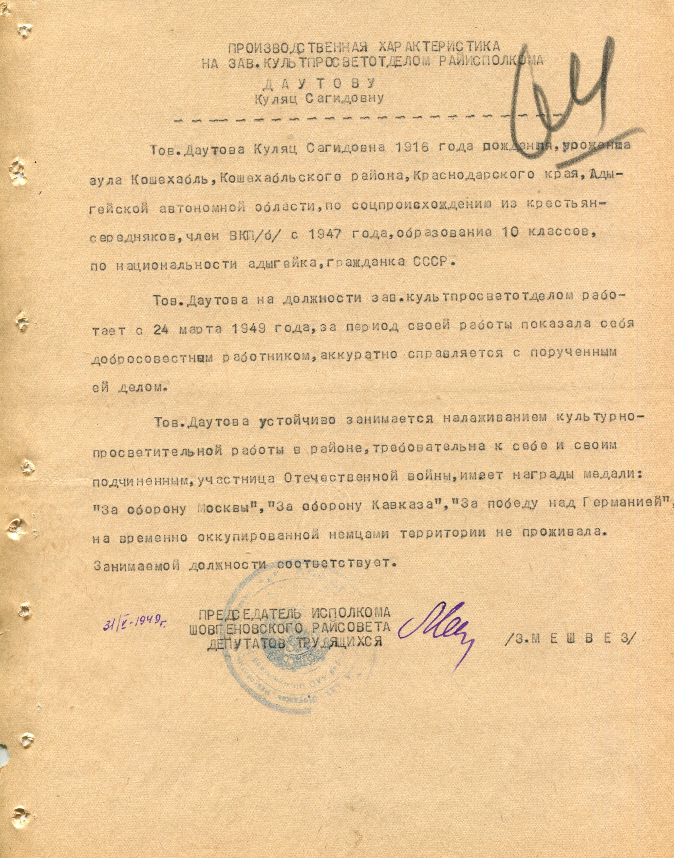 Даутова Куляц Сагидовна Исполком народных депутатов ССР Адыгея (Ф. 305, Оп. 1-л, д. 29)